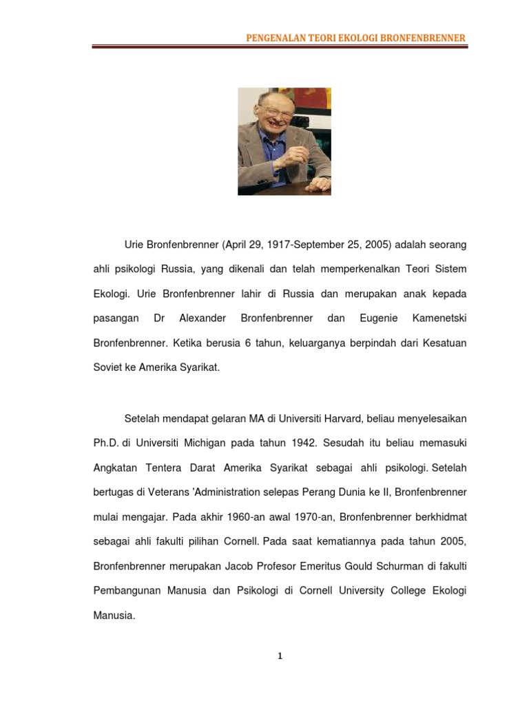 Grace kreig, pengarang buku teks psikologi pembangunan yang terkenal. Dalam teori ini menyatakan bahawa proses perkembangan dan pertumbuhan yang terangkum dalam sistem persekitaran itu mementingkan interaksi antara satu sama. Yaitu dimulai dari interaksi interpersonal sampai pengaruh budaya terhadap perkembangan seseorang. Tanınmış metin kitabı gelişim psikolojisi nin yazarı grace kreig, bronfenbrenner tarafından yaratılan modeli belki bugün insani gelişme için en etkili model olarak. Ekolojik sistemler kuramı üzerinde, sovyet gelişim psikoloğu lev vygotsky ve alman doğumlu psikolog kurt lewin'in önemli etkileri. Mikro sebahagian besar sosial individu dihabi skan sekolah, tempat kerja, keluarga. Teori ekologi bronfenbrenner melihat perkembangan anak dipengaruhi oleh konteks sosialnya. * teori sistem general * teori sistem ekologis 3 sebuah ekologi dalam istilah biologi adalah sistem berinteraksi organisme. Semoga video ini bermanfaat :). * secara konvensional teori sistem dibedakan dalam dua bagian sebagai berikut : Teori ekologi bronfenbrenner susi astriyani br ginting: Learn about bronfenbrenner ecological theory with free interactive flashcards. Pengenalan teori ekologi telah diperkembangkan oleh urie bronfenbrenner (1917).